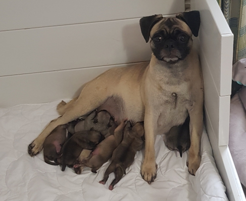 Unsere liebe Mathilde und der wunderschöne Caruso sind am 26.10.24 Eltern von sechs bezaubernden gesunden Retromopswelpen geworden.