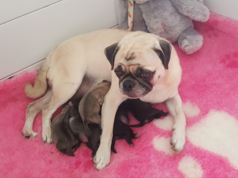 Unsere liebe Yana und der wunderschöne Sokrates sind am 11.05.2024 Eltern von fünf zauberhaften gesunden Mopswelpen geworden.